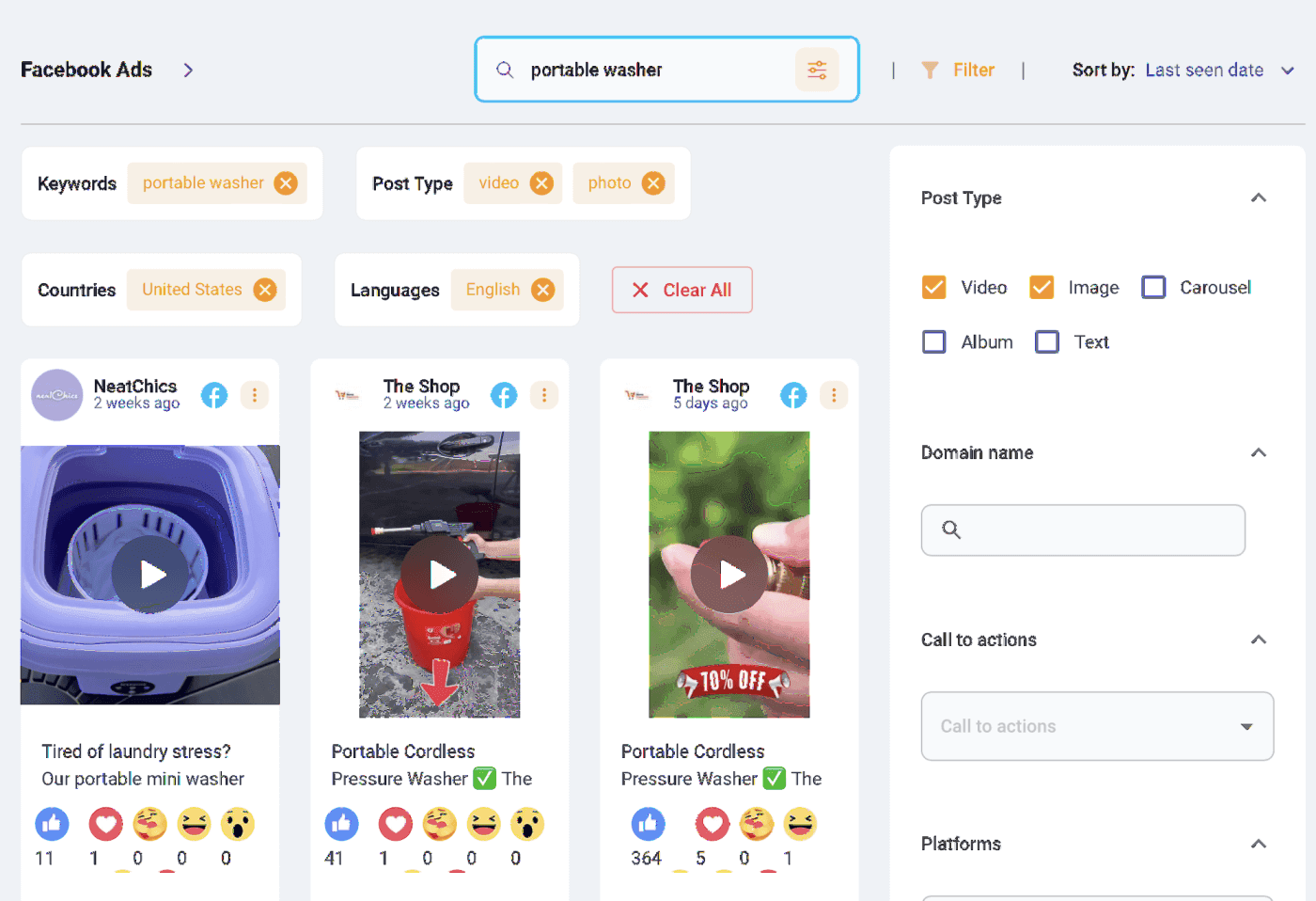 Their dashboard allows you to search for products based on keywords, filters, fulfillment platforms, and Facebook reactions.
