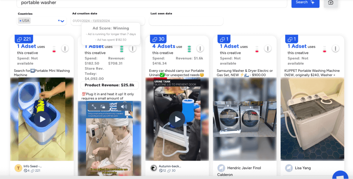 You can see the ad scores, number of ad sets, a shop’s revenue from selling the product, the total marketing budget spent on that creative, and how long the ad has been running.