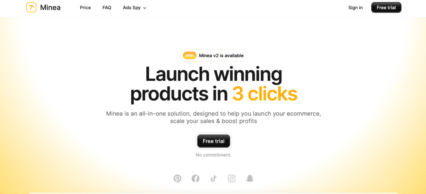Mineia is a dropshipping spy tool for Facebook, Pinterest, and TikTok. Its Ads dashboard shows hot products, which you can filter by popularity, engagement, eCom platform, or call-to-action.