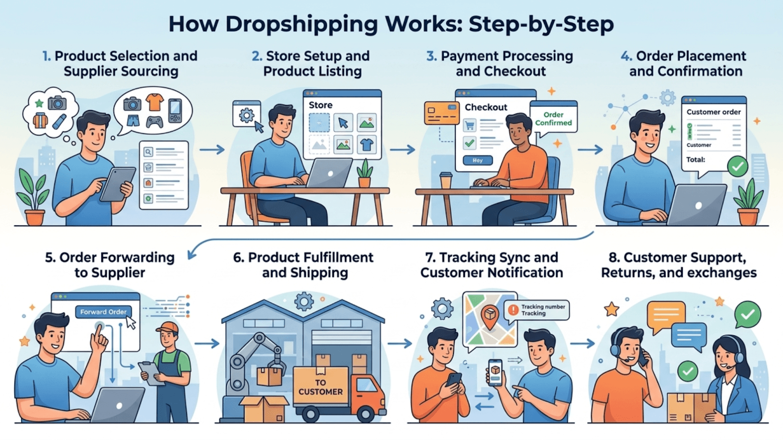 Most explanations stop before this point. They tell you what dropshipping is, but not how the process unfolds after the sale.