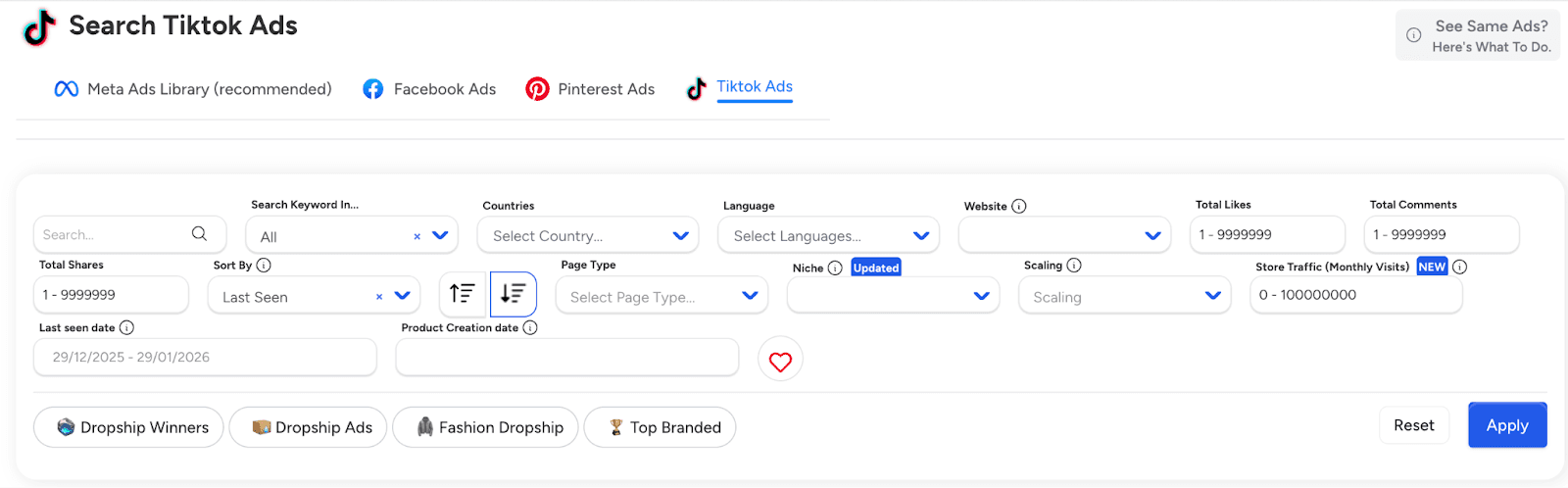 Start by filtering ads by platform inside WinningHunter. Facebook, TikTok, and Pinterest behave differently and reward different buying habits. Looking at them together blurs intent. Choose one platform and read only what belongs there.