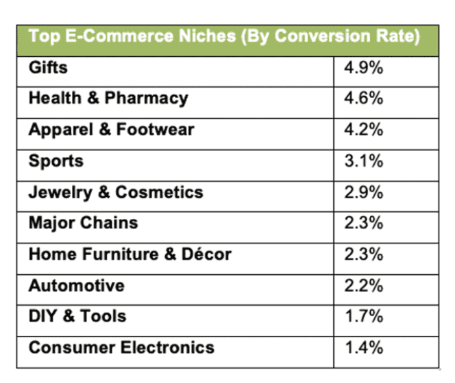 The conversion rate is the percentage of visitors who complete a purchase. This varies significantly across niches: