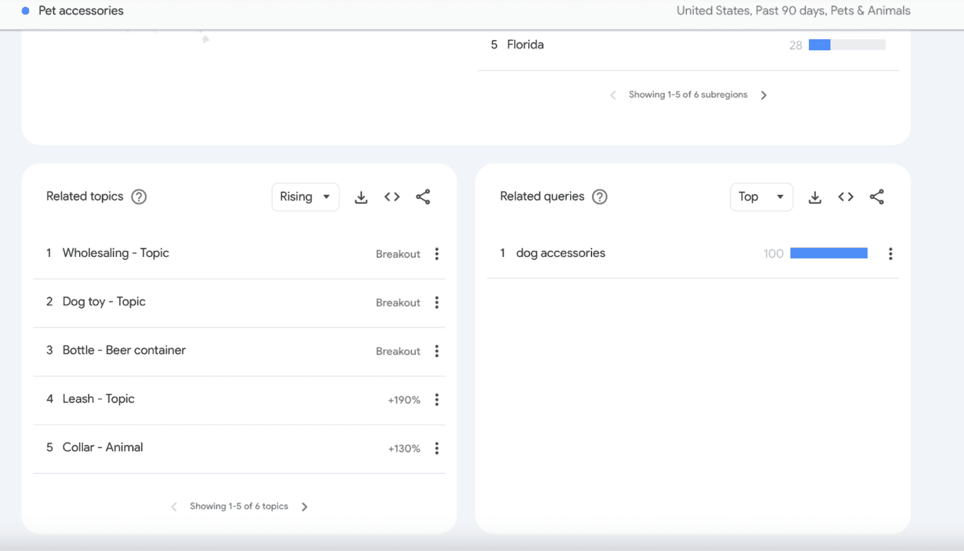 Users can start the search from general to specific niches. Each broad term can reveal related topics that you can use to identify winning products. Here’s an example using the keyword “Pet accessories.”