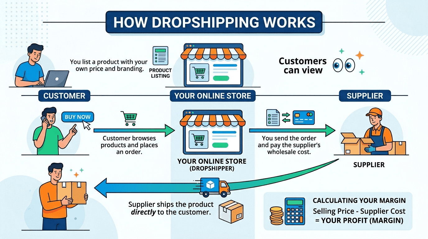 You bring in the customer, set the price, and control how the product is presented. The supplier handles storage and shipping. The customer never sees that handoff. From their perspective, your store is the business.
