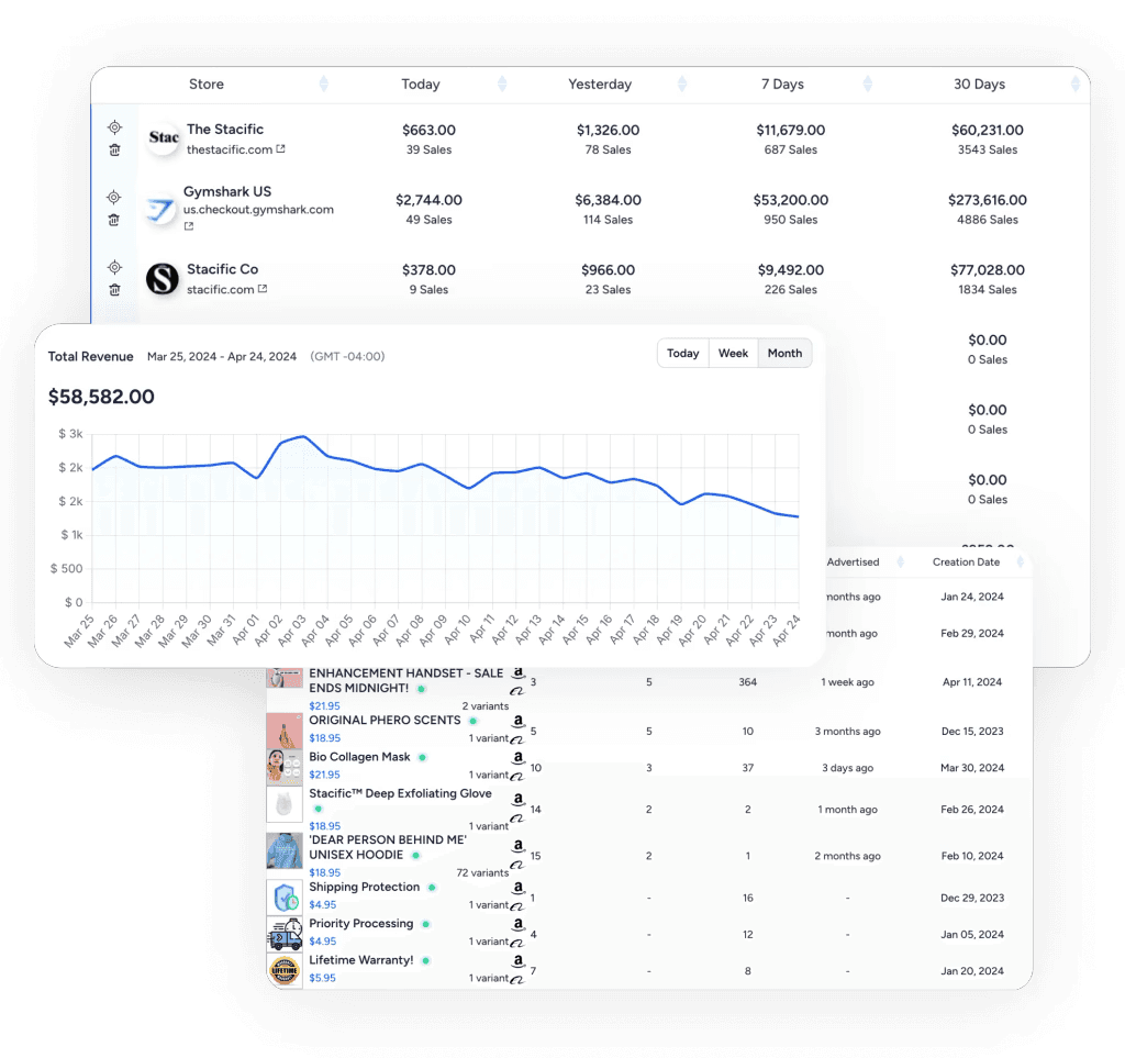Identify top performing products in any store, see how much revenue they make daily, and their ad spend per product to track sales performance.