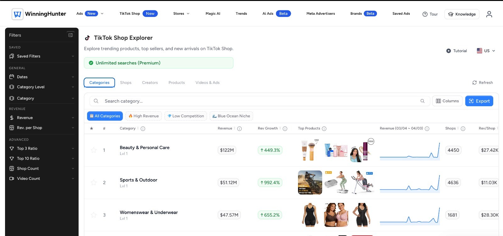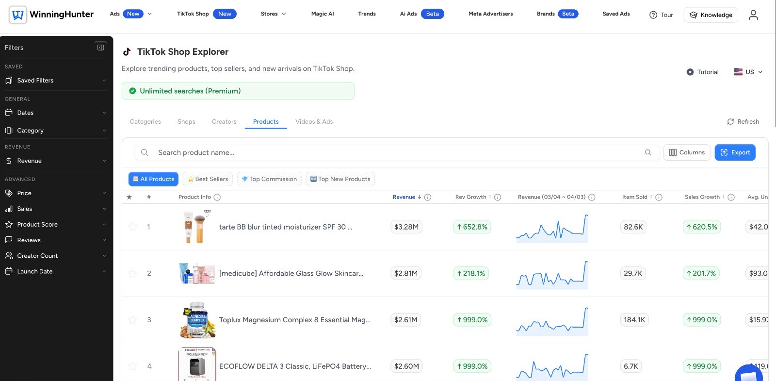 The top-selling TikTok products consistently span beauty & skincare, health & wellness, home & kitchen, tech accessories, and fashion. But category leadership shifts weekly. WinningHunter's live category rankings let you track which segments are growing fastest right now — and identify the next trending TikTok product category before it becomes crowded.