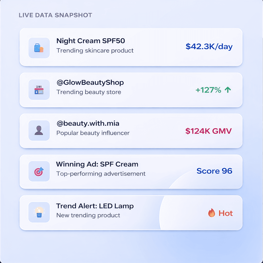 Instantly see revenue estimates, ad spend, creator performance, and competitor activity. Every data point is verified against real TikTok Shop signals.